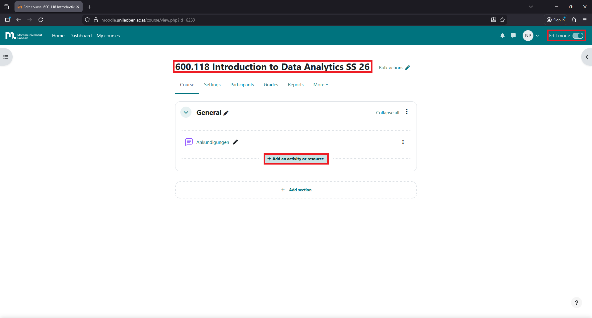 Go to your course page and activate the “edit mode”.