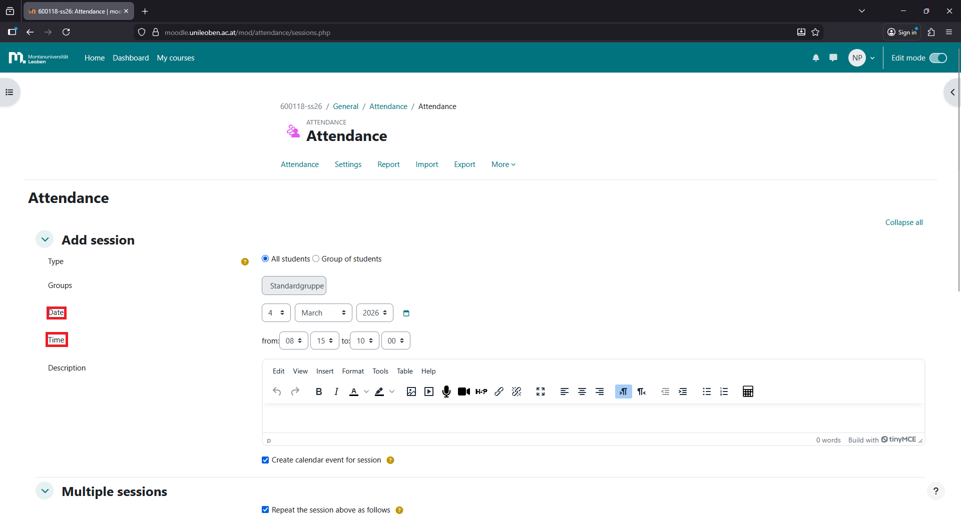 Fill in the details of the session and click “Save changes”
