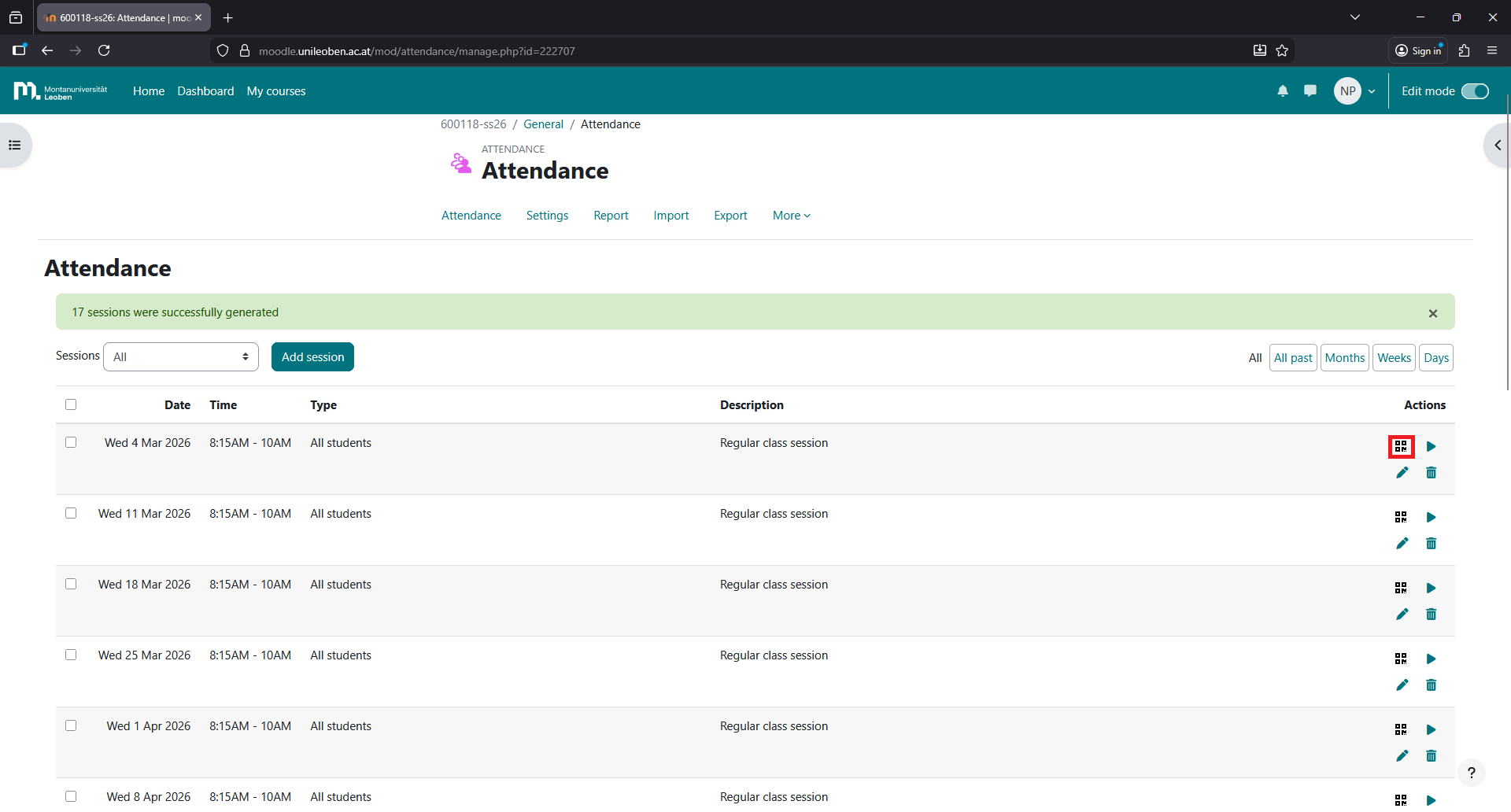 In the current lecture, click on the QR code symbol on the right to generate it. After a few seconds, a new QR code will be generated.